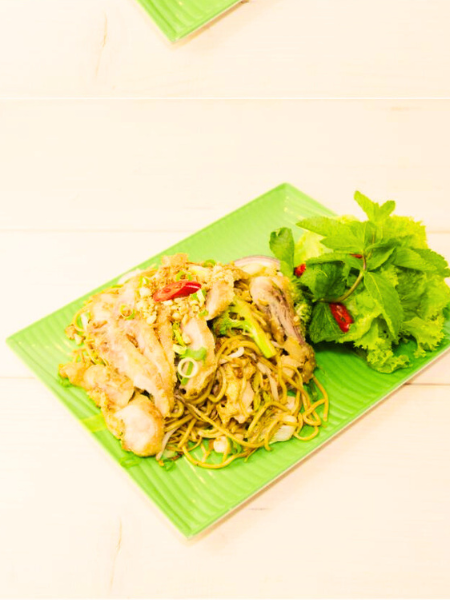 knusprige Ente mit gebratenen Reisbandnudeln, Salat und Kräuter